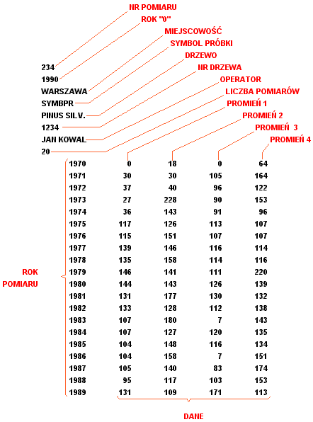 Poniżej pokazano strukturę zapisanego w pamięci pliku tekstowego z danym
